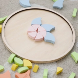 - Zawiera kolorowe klocki w pastelowych odcieniach, drewnianą okrągłą podstawkę i woreczek