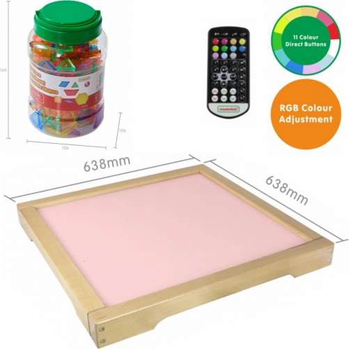 Podświetlany panel LED Masterkidz wnosi kolorowe światło do sali zabaw. Dzięki możliwości zmiany barw za pomocą pilota oraz 11 wstępnie ustawionym kolorom dzieci mogą odkrywać kombinacje i tworzyć świetlne efekty z klockami Montessori.