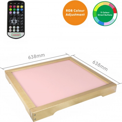 Panel LED od MASTERKIDZ to solidna, drewniana skrzynka z podświetleniem LED, którą można dostosowywać za pomocą pilota. Użytkownik może ustawić panel na jeden z 11 predefiniowanych kolorów lub ręcznie zmieniać światło, łącząc kolory podstawowe: czerwony, zielony i niebieski.