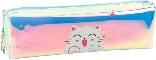 Szkolny piórnik z efektem holograficznym i motywem uroczego kociaka łączy nowoczesny styl z dziecięcą radością. Tęczowa, lśniąca powierzchnia przyciąga wzrok i doskonale uzupełnia kolorową szkolną wyprawkę.