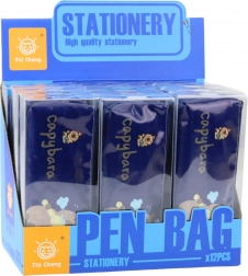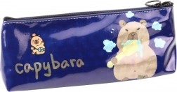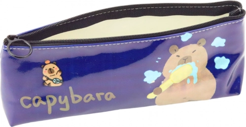 Ten granatowy piórnik z połyskiem i zabawnym motywem kapibary myjącej zęby z pewnością przyciągnie uwagę. Ilustracja wywołuje uśmiech, a jednocześnie przypomina o znaczeniu dbania o zdrowie. Napis „capybara” wraz z pastelowymi chmurami tworzy figlarny wygląd.