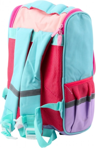 Po bokach plecaka znajdują się dwie elastyczne kieszenie na butelkę lub bidon, a pas piersiowy wspiera prawidłowe rozłożenie ciężaru. Elementy odblaskowe poprawiają widoczność dziecka na drodze.