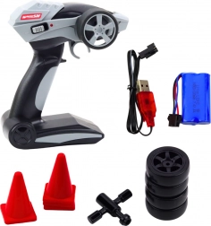 W zestawie znajduje się również zapasowy komplet opon, klucz do ich wymiany oraz pachołki do treningu driftu. Ten model rozwija zdolności motoryczne, refleks oraz pasję do technologii i sportowej jazdy.