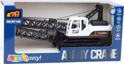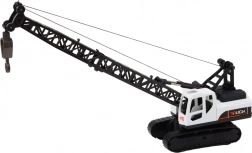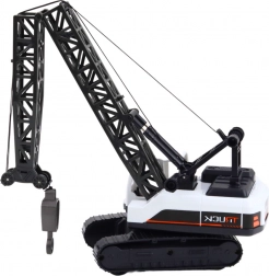 Żuraw ma ruchome ramię z hakiem, które można podnosić i opuszczać. Ramię żurawia porusza się na przegubach a obrotowa podstawa umożliwia pełen obrót o 360°. Cała konstrukcja osadzona jest na solidnym podwoziu gąsienicowym, co zwiększa realizm i stabilność. Zabawka została zaprojektowana w biało-czarnych barwach z detalami imitującymi profesjonalny sprzęt budowlany.