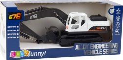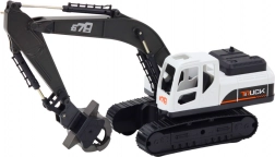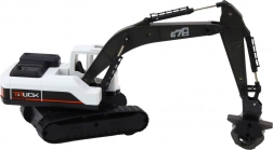 Koparka gąsienicowa jest wyposażona w szpon zamiast tradycyjnej łyżki, ma przegubowe ramię z kilkoma ruchomymi punktami i rotację 360° podstawy. Podwozie na gąsienicach zapewnia stabilność i masywny wygląd jak prawdziwe maszyny budowlane. Model w nowoczesnej czarno-biało-szarej kolorystyce doskonale pasuje do każdej kolekcji zabawek budowlanych.