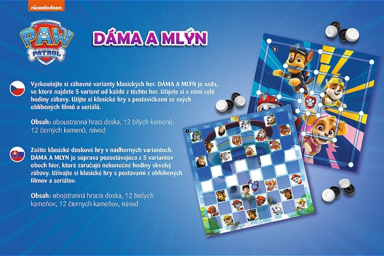 Tchnij nowe życie w klasyczne gry z ulubionymi bohaterami z serialu Psi Patrol. Zestaw oferuje kilka możliwości rozegrania zarówno warcabów, jak i młyna, a dzięki jasnym zasadom idealnie nadaje się na rodzinne wieczory oraz pierwsze strategiczne kroki dzieci.