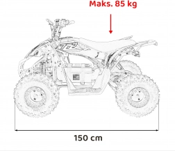 Dla komfortu podczas dłuższych tras zastosowano miękkie, wodoodporne siedzenie o wymiarach 61 × 29 cm oraz praktyczne sterowanie kluczykiem. Quad jest odpowiedni dla użytkowników do 85 kg, ma prześwit 19 cm i wymiary 150 × 96 × 89 cm, oferując przestrzeń, stabilność i niezbędną dzielność terenową.