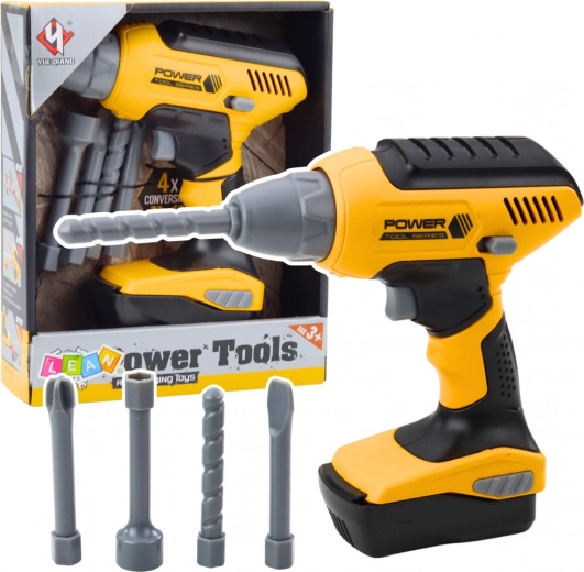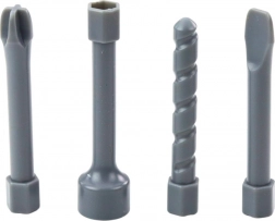 W zestawie znajdują się 4 wymienne bity: wiertło, płaski śrubokręt, krzyżakowy śrubokręt oraz klucz. Dzieci mogą dopasować narzędzie do swoich „napraw”.