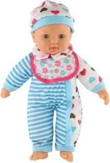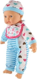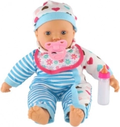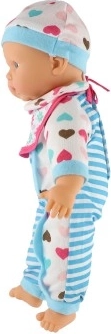 Lalka jest ubrana w niebiesko-białe prążkowane ubranko z uroczymi serduszkami. Jest wyposażona w smoczek i butelkę, co dodaje realistyczny element zabawie.