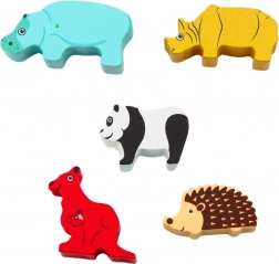 Zestaw zawiera ręcznie malowane, drewniane figurki przedstawiające egzotyczne i leśne zwierzęta, takie jak słoń, panda, kangur czy jeż. Wszystkie elementy wykonane są z naturalnego drewna i pomalowane nietoksycznymi farbami, co gwarantuje bezpieczną zabawę nawet dla najmłodszych. Gładko oszlifowane krawędzie eliminują ryzyko drzazg i uszkodzeń.