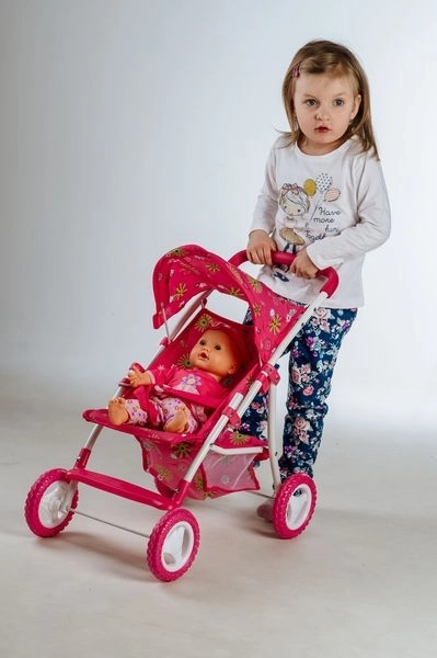 Sportowy wózek dla lalek oferuje doskonałą stabilność i łatwość obsługi dzięki swojej solidnej konstrukcji z połączenia metalu i plastiku. Dzięki składanemu daszkowi można łatwo chronić lalkę przed „słoneczkiem”. Przestrzeń do przechowywania na dole jest idealna do przewożenia wszystkich niezbędnych akcesoriów potrzebnych na codzienne przygody. Ten wózek jest zaprojektowany tak, aby odpowiadać potrzebom dzieci od 3 roku życia.