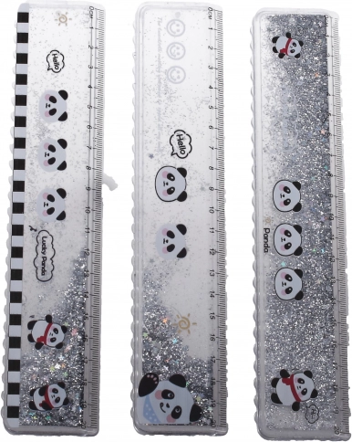 Linijka 20 cm z motywem pandy, zawiera ciecz i brokat. Dostępna w trzech wariantach.