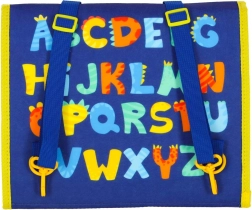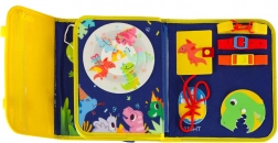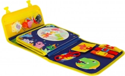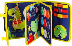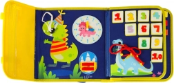 - Strona 1: Filcowe tło z ćwiczeniami na zdolności manualne, zegar do nauki czytania czasu, sznurek ściągający, kieszonka na suwak, but do nauki zapinania na rzep.