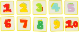 - Strona 2: Tło z motywem dinozaura, sznurek do przeplatania, liczby do nauki liczenia z angielskimi podpisami.