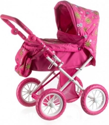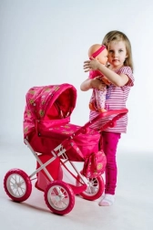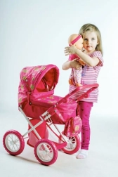 Elegancki wózek dla lalek jest idealny dla małych mam. Zawiera praktyczny pojemnik oraz torbę na niezbędne akcesoria.