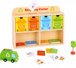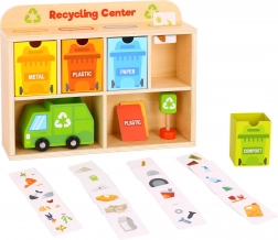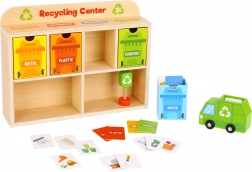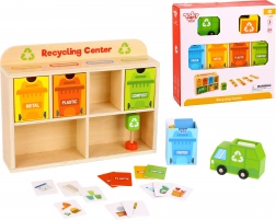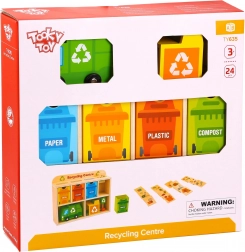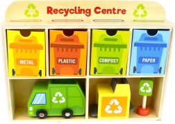 Z Centrum Recyklingu od Tooky Toy dzieci nauczą się, jak prawidłowo segregować odpady. Każda karta przedstawia odpad z różnych materiałów, który dzieci wkładają do śmieciarki, następnie do sortowni, a na końcu do odpowiedniego pojemnika umieszczonego w drewnianej szafce.