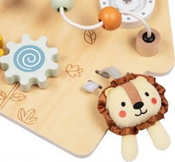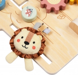 - zębate kółka, przesuwne klocki ze zwierzątkami, przesuwne dyski z owadami, lusterko, tęczowy łuk z koralikami, obrotowy wałeczek z kuleczkami, otwierane okienko, pluszowa główka lwa
