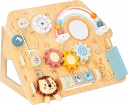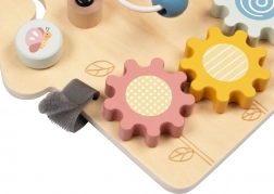 - Różnorodne aktywności: zębate kółka, przesuwne klocki ze zwierzątkami, obrotowy wałeczek z kuleczkami, otwierane okienko, przesuwne dyski z obrazkami owadów, tęczowy łuk z koralikami i lusterko.