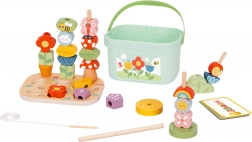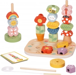 Drewniane edukacyjne pudełko Magic Garden przenosi dzieci w barwny świat liści, kwiatów i uroczych owadów. Wspiera małą motorykę, logiczne myślenie oraz kreatywność dzięki połączeniu nawlekania, sortowania i budowania wzorów według kart aktywności. Solidne drewniane elementy w pastelowych kolorach dobrze leżą w dłoni i zachęcają do wielokrotnej zabawy.