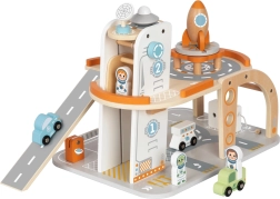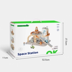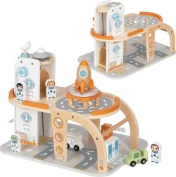 Ta przemyślanie zaprojektowana drewniana zabawka przeniesie dzieci w świat kosmicznych misji. Wielopoziomowa konstrukcja z czytelnym oznakowaniem tras, ruchomą windą i długą rampą zjazdową zachęca do historii pełnych startów, lądowań i zadań serwisowych. Zestaw uzupełniają figurki astronautów, lądowisko z rakietą, łazik oraz inne akcesoria do realistycznej zabawy.
