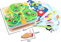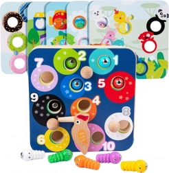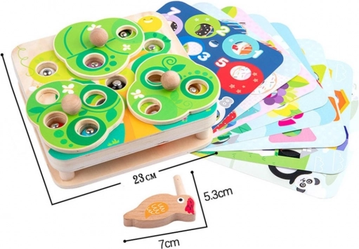 Ta drewniana edukacyjna gra 2w1 przynosi dzieciom radość odkrywania. Obracane zielone „liście” skrywają magnetyczne robaczki i dodają do zabawy element niespodzianki i wyzwania. Drewniany ptaszek z magnetycznym dziobkiem pomaga dzieciom precyzyjnie celować, chwytać i przenosić robaczki do otworów, co wzmacnia motorykę małą oraz cierpliwość.