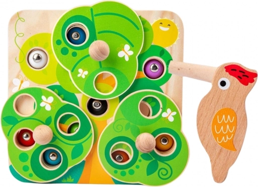 Drewniany ptaszek z magnetycznym dziobkiem pozwala łatwo chwytać i przenosić robaczki. Dzieci trenują precyzję, chwyt i koordynację ręka–oko przy każdym „połowie”.