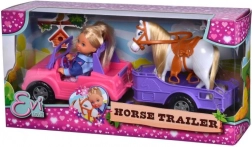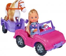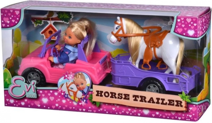 Ten zestaw dostarcza dzieciom wszystkiego, czego potrzebują do jeździeckich przygód. Laleczka Evi Love prowadzi stylowy różowy kabriolet, który ciągnie fioletową przyczepę do wygodnego przewozu konika. Dzięki obracającym się kołom i odczepianej przyczepie zabawa jest płynna i wciągająca w domu i w podróży.