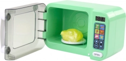 Panel sterowania posiada wiele przycisków z ikonami potraw i symbolami czasu, co daje dzieciom podstawową wiedzę związaną z gotowaniem i obsługą sprzętów kuchennych. Przycisk „OPEN” umożliwia łatwe otwieranie drzwiczek, wykonanych z przezroczystego materiału, aby dziecko mogło obserwować „gotujący się” posiłek w środku.