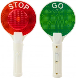 Dziecięcy policyjny sygnalny paletka STOP/GO jest zaprojektowany, by przypominać prawdziwą paletkę używaną przez policjantów drogowych. Z jednej strony ma czerwony panel z napisem STOP, z drugiej zielony z napisem GO. Obie strony są dobrze widoczne i czytelne, co pozwala na użycie paletki nawet o zmierzchu dzięki podświetleniu. Zabawka działa na baterie i jest wyposażona w ergonomiczną rączkę odpowiednią dla małych dziecięcych rąk.