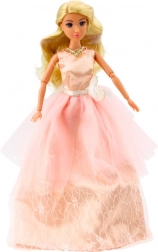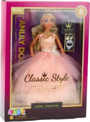 Lalka Anlily w pudrowej wieczorowej sukni prezentuje się niezwykle dzięki wachlarzowemu zdobieniu falban i ozdobnej kokardzie. Ma długie blond włosy, które można czesać i stylizować, a jej delikatny makijaż i wyraziste rysy nadają lalce ciepły i elegancki wygląd. Dzięki ruchomym kończynom – rękom, nogom i głowie – lalka idealnie nadaje się do dynamicznej zabawy, przebierania oraz tworzenia codziennych i bajkowych opowieści.