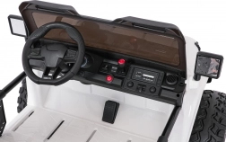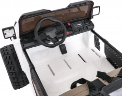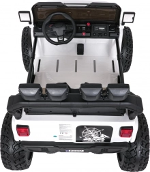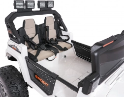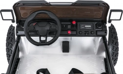 Podwójne siedzenie z eko skóry z pasami bezpieczeństwa, pilot 2,4 GHz z 3 prędkościami i przyciskiem STOP. Panel multimedialny z Bluetooth, USB, MP3 i AUX do odtwarzania ulubionej muzyki.