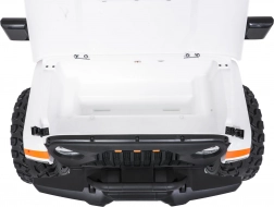 Bezpieczeństwo zapewniają pasy, płynny miękki start, zdalny pilot 2,4 GHz z trzema prędkościami i awaryjnym przyciskiem Stop. Dzieci ucieszą światła LED (przednie, tylne, górne) z wyłącznikiem oraz panel multimedialny z Bluetooth, USB, MP3 i AUX. Pod maską znajduje się praktyczny schowek 51 × 26 × 8 cm.