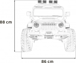 Solidny dziecięcy elektryczny samochodzik z dwoma siedzeniami i napędem 4x4 do jazdy w terenie. Oferuje mocne silniki (2×200 W z przodu i 2×280 W z tyłu), akumulator 24 V (2×12 V 7 Ah w szeregu), ogromne koła EVA 40 × 14 cm, oświetlenie LED z przodu, z tyłu i na dachu, rozbudowany panel audio z Bluetooth/USB/MP3 oraz bezpieczne pasy na obu siedzeniach. Idealny dla dwojga dzieci i zabawy w ogrodzie oraz poza utwardzonymi drogami.