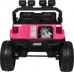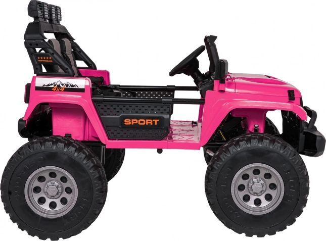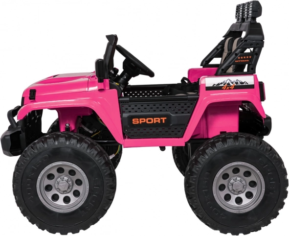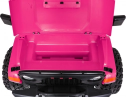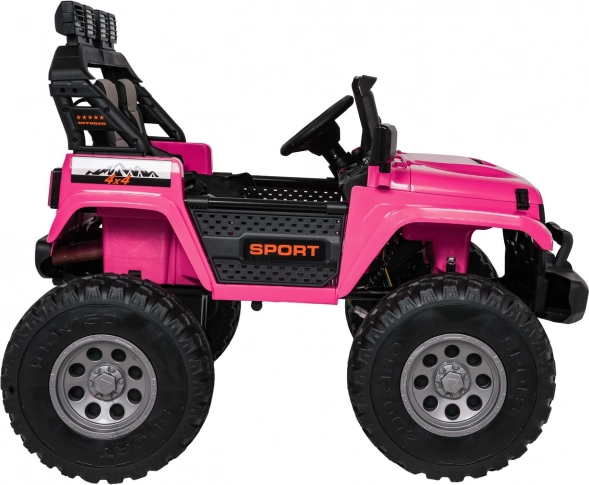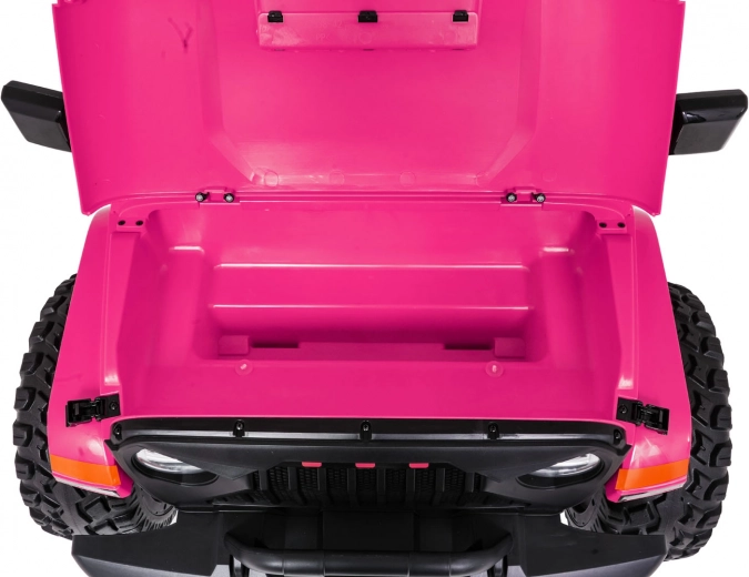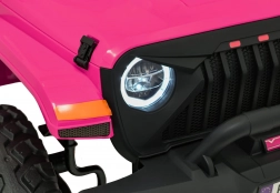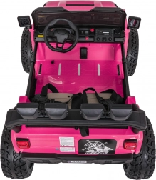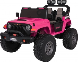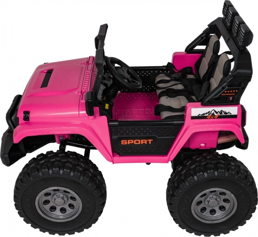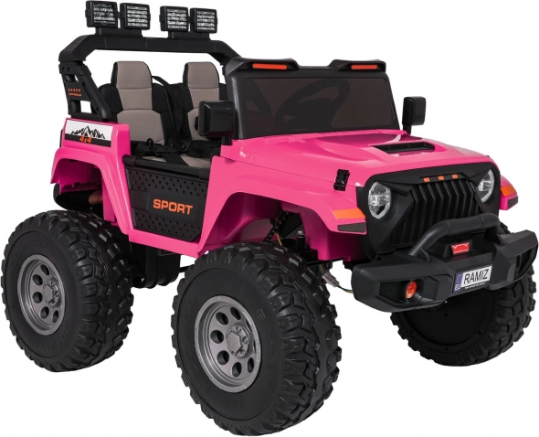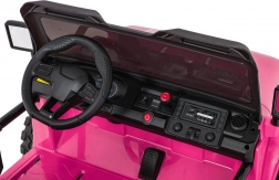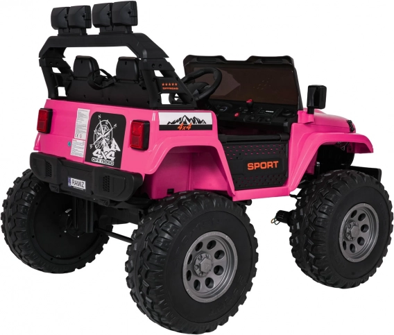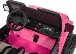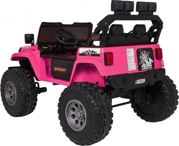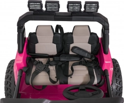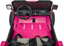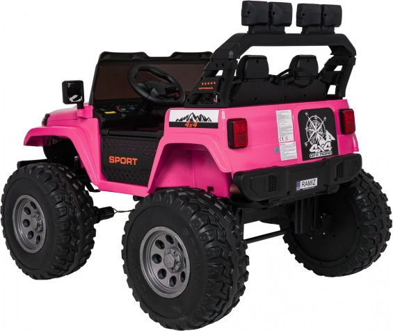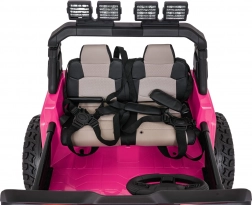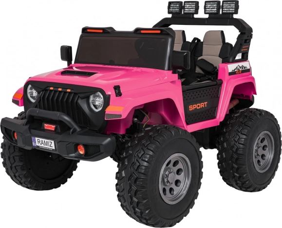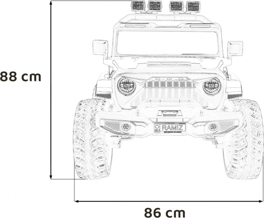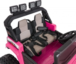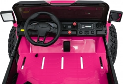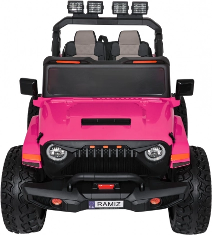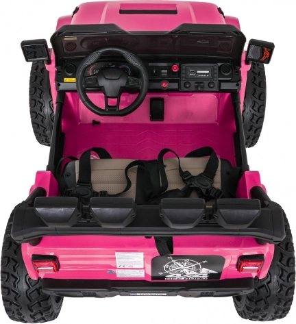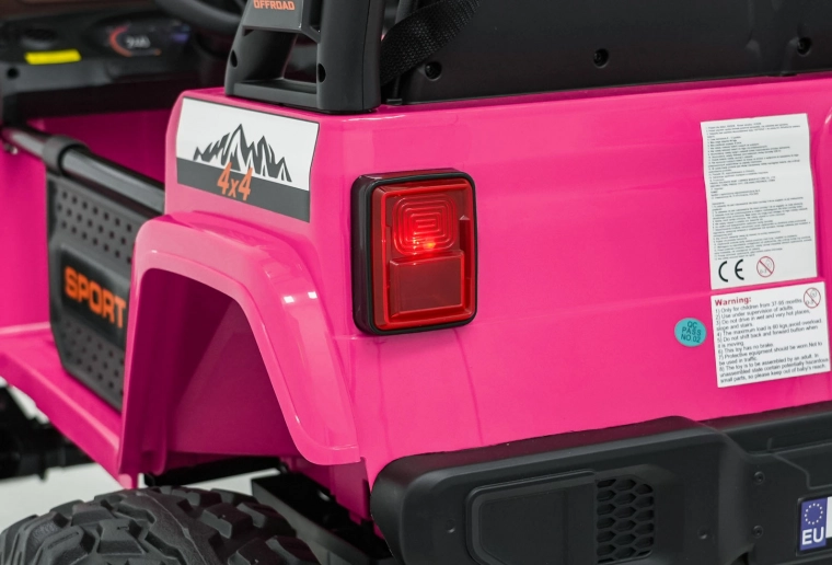 Wnętrze zachwyca podwójnym siedziskiem z ekoskóry z pasami, czytelnym panelem i schowkiem pod maską na drobiazgi. O świetlny efekt dbają przednie i tylne LED oraz dachowa rampa świetlna z własnym włącznikiem. Rodzice docenią pilot 2,4 GHz z 3 prędkościami i bezpiecznym przyciskiem Stop.