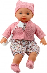 Laleczka dla dzieci w uroczystym komplecie, w tym miękki różowy sweterek, czapeczka z uszkami oraz wzorzyste spodenki. Ubranko można łatwo zdjąć, co pozwala dopasować zabawę do własnych pomysłów. Dzięki realistycznemu wyglądowi, w tym otwartym ustom i oczom, prawdziwie przypomina niemowlę, co wspiera dzieci w rozwijaniu opiekuńczości i odpowiedzialności.
