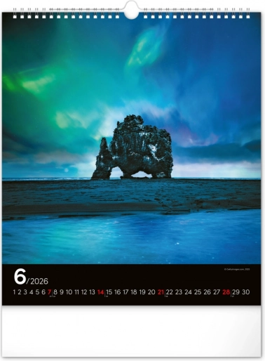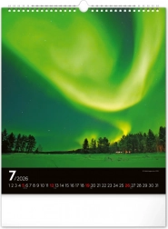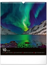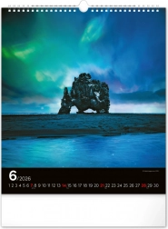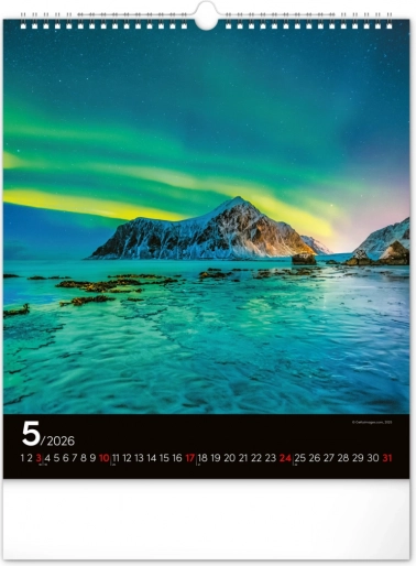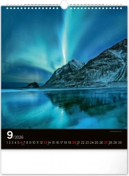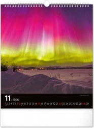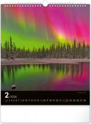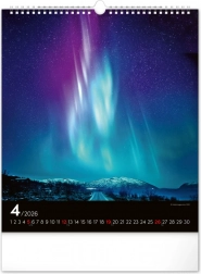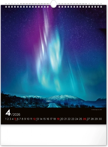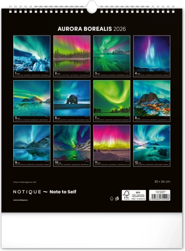 - Kalendarz zawiera dwanaście unikalnych zdjęć, które przeniosą Cię w krajobrazy pod zorzami polarnymi.