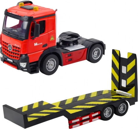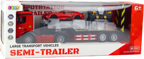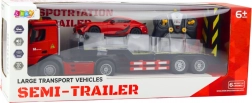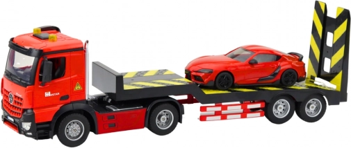 Zestaw zawiera ciężarówkę z przyczepą oraz sportowy samochód w żywym czerwonym kolorze. Za pomocą pilota możesz prowadzić ciężki pojazd we wszystkich kierunkach oraz wygodnie załadować i rozładować auto sportowe. Auto sportowe jest również zdalnie sterowane, co zapewnia ekscytującą jazdę po podłogach, dywanach lub torach wyścigowych.
