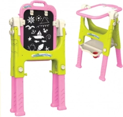 Tablica ma regulowaną wysokość i kąt nachylenia, co pozwala dostosować ją do wieku i wzrostu dziecka. W zestawie znajdziesz komplet podstawowych akcesoriów: 12 kredek, 12 kolorowych kred, 4 markery wodne, 10 arkuszy A4, gąbkę oraz organizer na przybory. Dzięki stabilnej podstawie i solidnemu krzesełku dziecko może wygodnie tworzyć, rozwijać zdolności manualne i wyobraźnię przestrzenną.