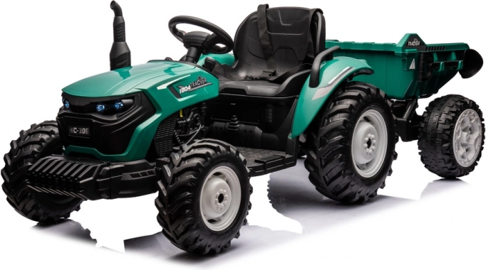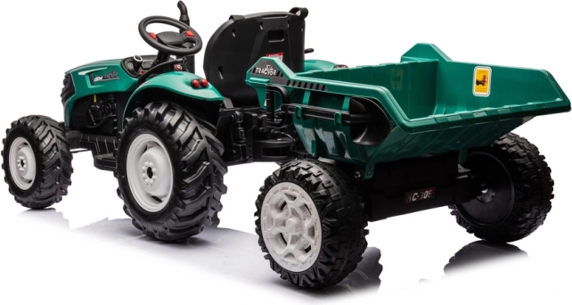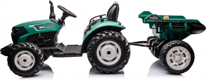 Traktor na akumulator z ciemnozieloną przyczepą dla dzieci. Mocny akumulator 24V, realistyczny design, bezpieczne sterowanie. Świetna zabawa w ogrodzie.