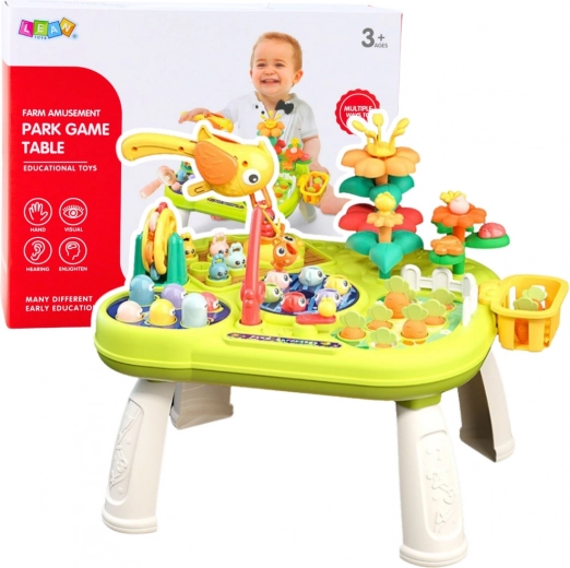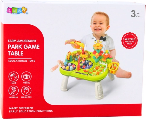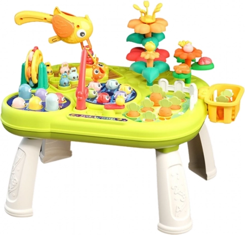 Zestaw zawiera różne funkcje, takie jak łowienie rybek specjalną wędką, gra w uderzanie kretów (whack-a-mole), ogrodnictwo oraz dopasowywanie kształtów i kolorów. Każda aktywność wspiera inne obszary rozwoju, takie jak koordynacja ręka-oko, myślenie logiczne, koncentracja oraz nauka podstawowych relacji przestrzennych. Kolorowe, dynamiczne elementy stymulują zmysły.