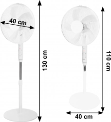 Wentylator stojący o mocy 45 W zapewnia efektywną cyrkulację powietrza dzięki 5 łopatkom i 3 różnym trybom z możliwością regulacji siły nadmuchu. Wyposażony w pilot zdalnego sterowania dla wygodnej obsługi oraz timer do automatycznego wyłączania.
