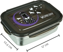 Lunchbox z motywem Wednesday łączy styl i funkcjonalność. Wykonany ze stali nierdzewnej, zapewnia długą żywotność i łatwą pielęgnację. Jego kompaktowe wymiary i niska waga sprawiają, że doskonale nadaje się do codziennego użytku w szkole lub podczas wycieczek.