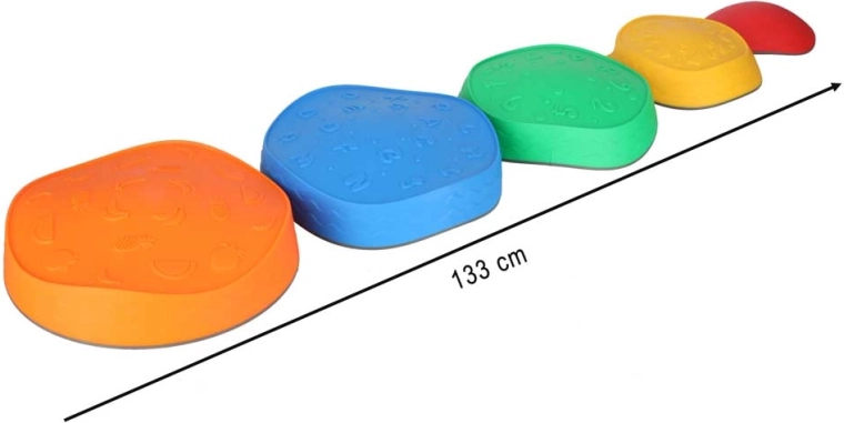 Dzięki solidnej konstrukcji i antypoślizgowym podkładkom kamienie pozostają stabilne na różnych podłogach. Wytrzymały poliuretan jest przyjemny w dotyku i łatwy w czyszczeniu. Kolorowe motywy (liczby, litery, kształty, owoce, wzory) wspierają naukę poprzez zabawę oraz rozwój małej i dużej motoryki.