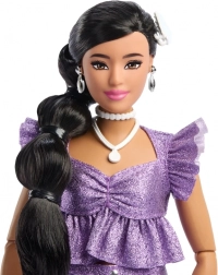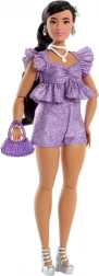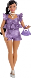 Stylowa lalka Barbie przychodzi w imprezowym zestawie z błyszczącym fioletowym topem i szortami, uzupełnionym biżuterią i torebką. Ma w pełni zginane i ruchome ciało do realistycznego pozowania, dopracowany wygląd oraz mnóstwo modnych akcesoriów do kreatywnych historii i przebieranek.