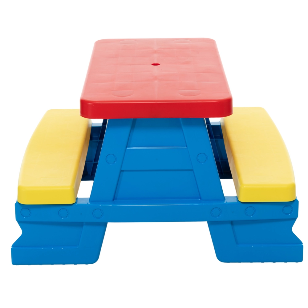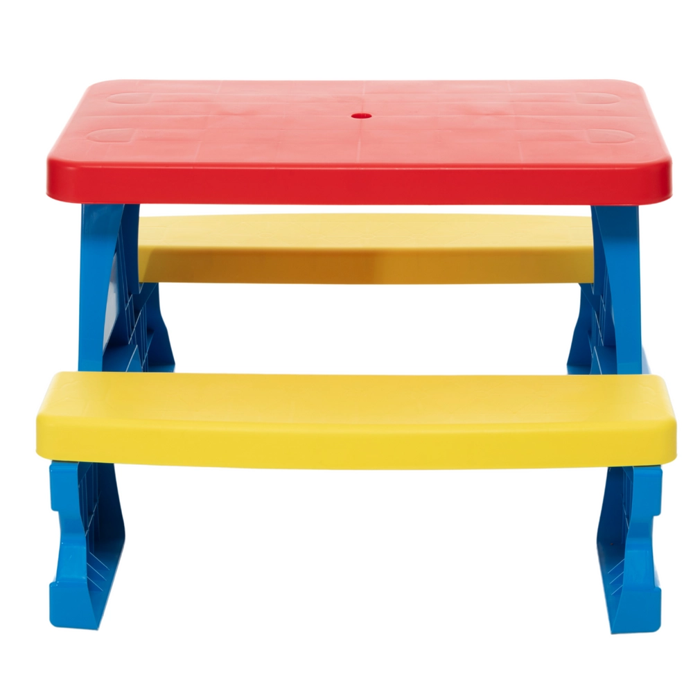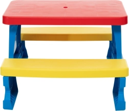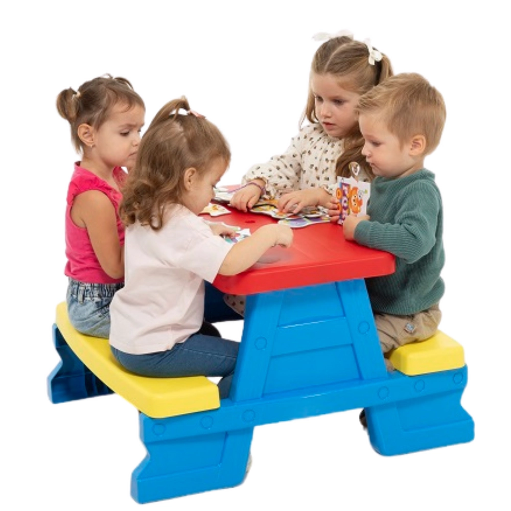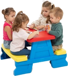 Żywe kolory sprawiają, że stolik jest szczególnie atrakcyjny dla dzieci i zachęca do aktywności na zewnątrz.