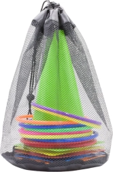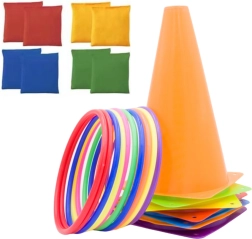 W skład zestawu wchodzi 11 kolorowych obręczy, które świetnie nadają się do gier rzutnych i aktywności zręcznościowych, 6 stożków treningowych do torów przeszkód oraz 10 worków gimnastycznych, które mogą być używane do sensorycznych gier, rzutów bądź jako obciążenie. Wszystkie komponenty wykonane są z trwałych i bezpiecznych materiałów, odpowiednich dla dzieci i dorosłych.