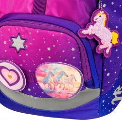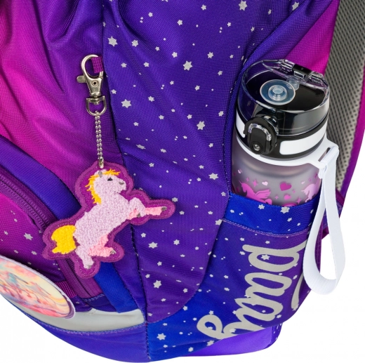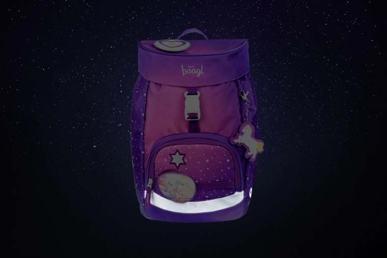 Materiał plecaka wykonano z materiału z recyklingu i wodoodpornego, wzbogaconego o elementy odblaskowe dla maksymalnego bezpieczeństwa przy ograniczonej widoczności. Wygląd plecaka można łatwo zmieniać dzięki odpinanym przypinkom.