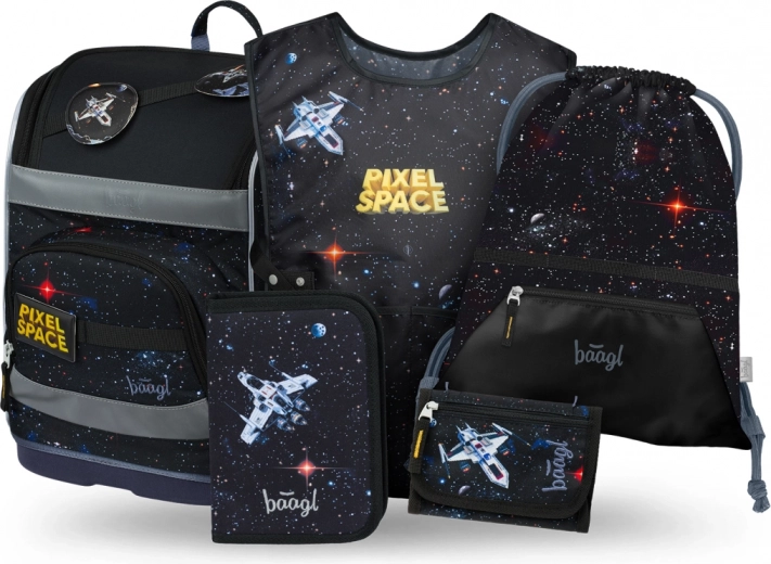 Ten zestaw szkolny Zippy Plus Pixel Space od Baagl zawiera aktówkę, piórnik, worek, fartuszek oraz portfelik. Odpowiedni dla młodszych uczniów, z naciskiem na funkcjonalność i jakość.