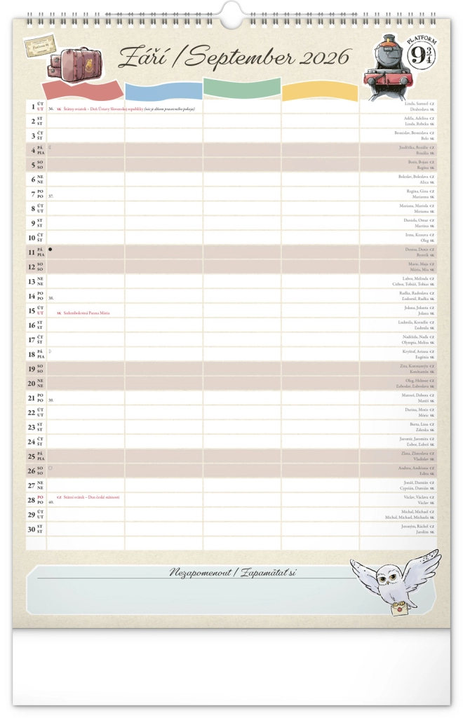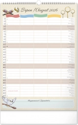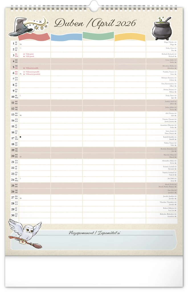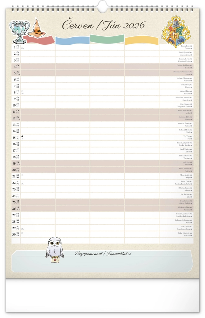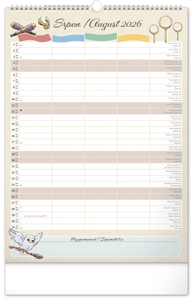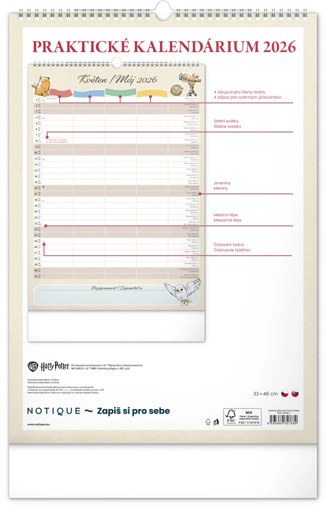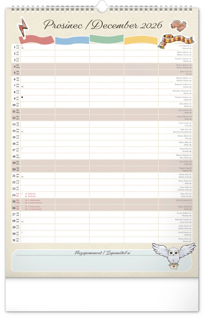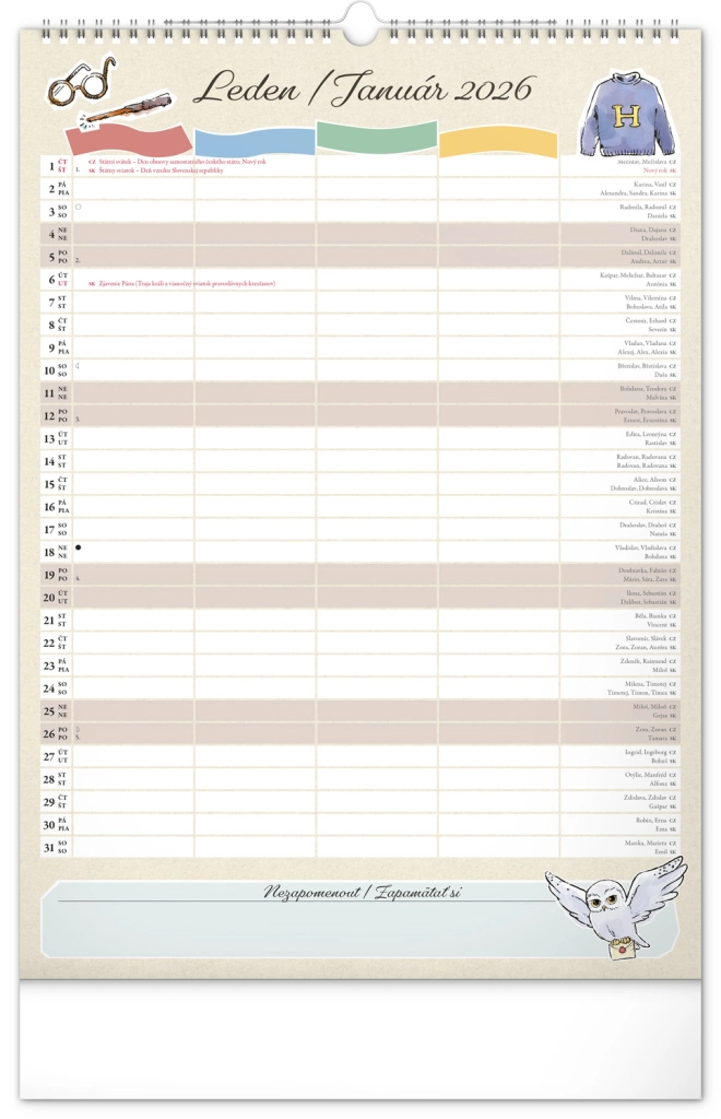 Przedstawiamy rodzinny ścienny kalendarz planujący, który wniesie magię świata Harry’ego Pottera do Twojego domu. Każdego miesiąca możesz cieszyć się ilustracjami i motywami ulubionych bohaterów oraz miejsc z czarodziejskiego świata. Kalendarz uwzględnia czeskie i słowackie kalendarium, zawiera święta państwowe i fazy księżyca i jest idealnym pomocnikiem do organizacji aktywności mugoli i czarodziejów.