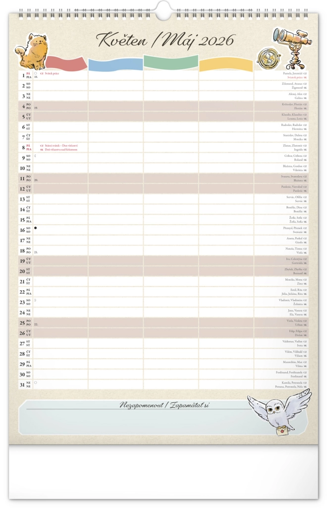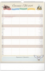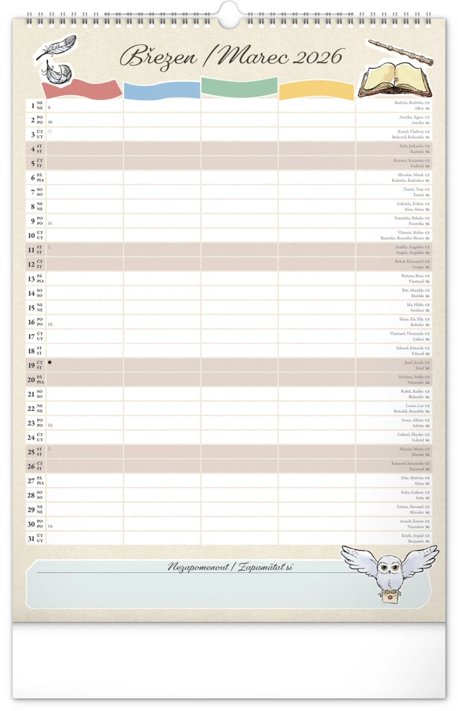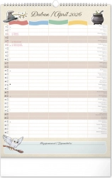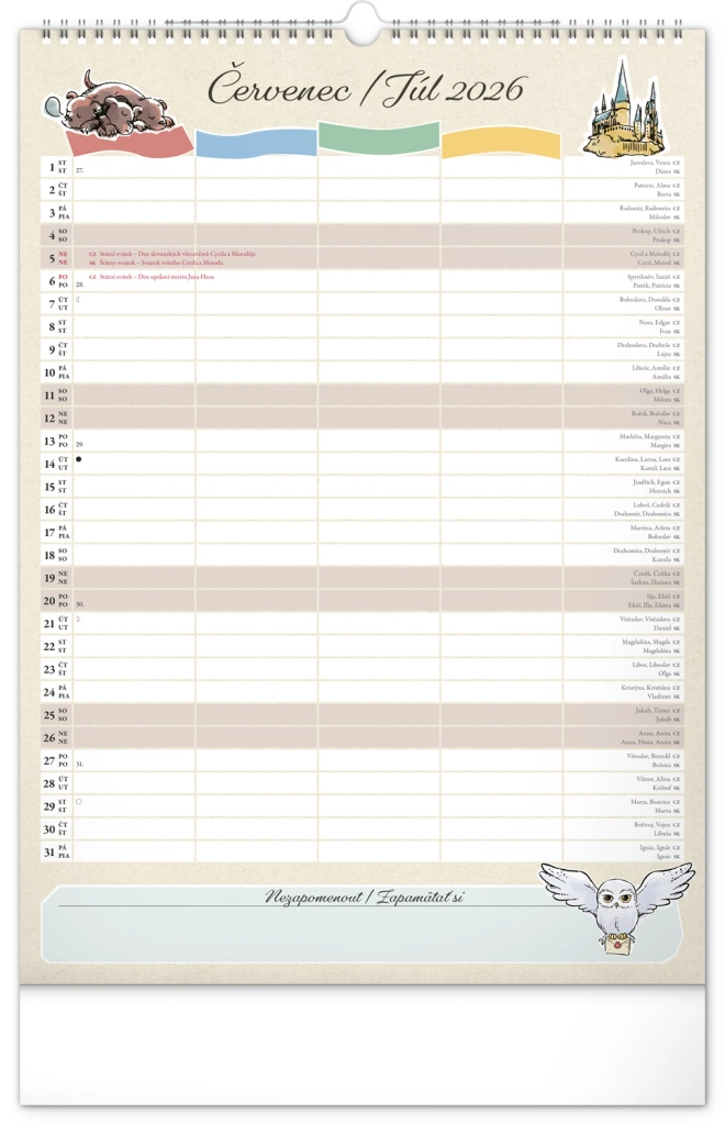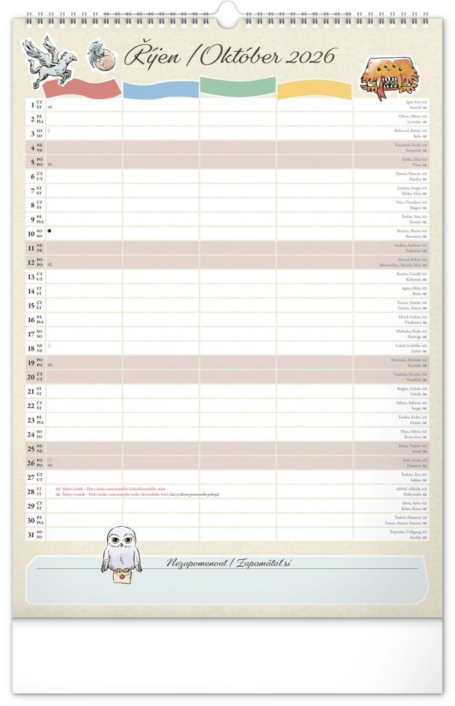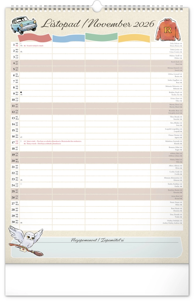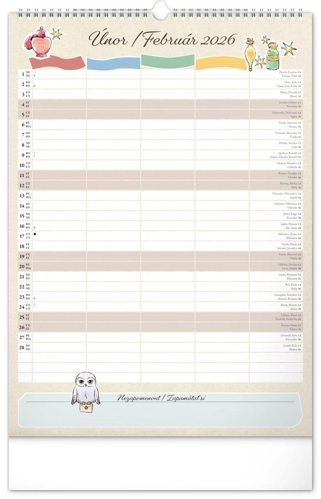 Przedstawiamy rodzinny ścienny kalendarz planujący, który wniesie magię świata Harry’ego Pottera do Twojego domu. Każdego miesiąca możesz cieszyć się ilustracjami i motywami ulubionych bohaterów oraz miejsc z czarodziejskiego świata. Kalendarz uwzględnia czeskie i słowackie kalendarium, zawiera święta państwowe i fazy księżyca i jest idealnym pomocnikiem do organizacji aktywności mugoli i czarodziejów.